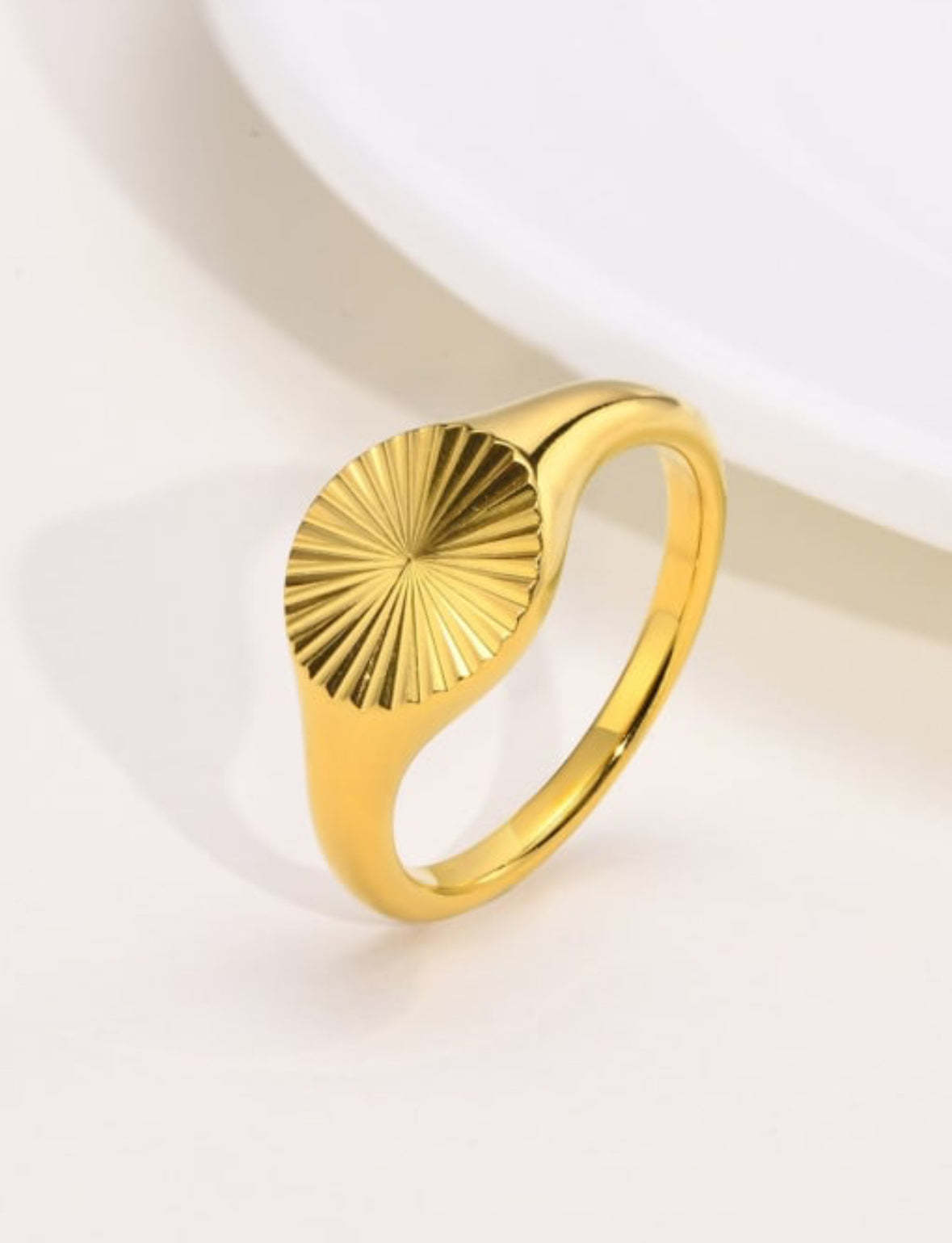 S'inscrireBague en acier inoxydable plaqué or 18k avec un milieu imprimé de rayons.