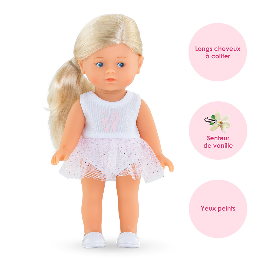 Rosy ballerine est habillée d'une élégante tenue de danse tout-en-un, composée d'un justaucorps et d'un joli jupon en tulle à paillettes, et d'une paire de chaussures moulées blanches. Elle porte également 1 petit gilet rose assorti à sa tenue, 1 paire de guêtres rose et 1 tiare rose.