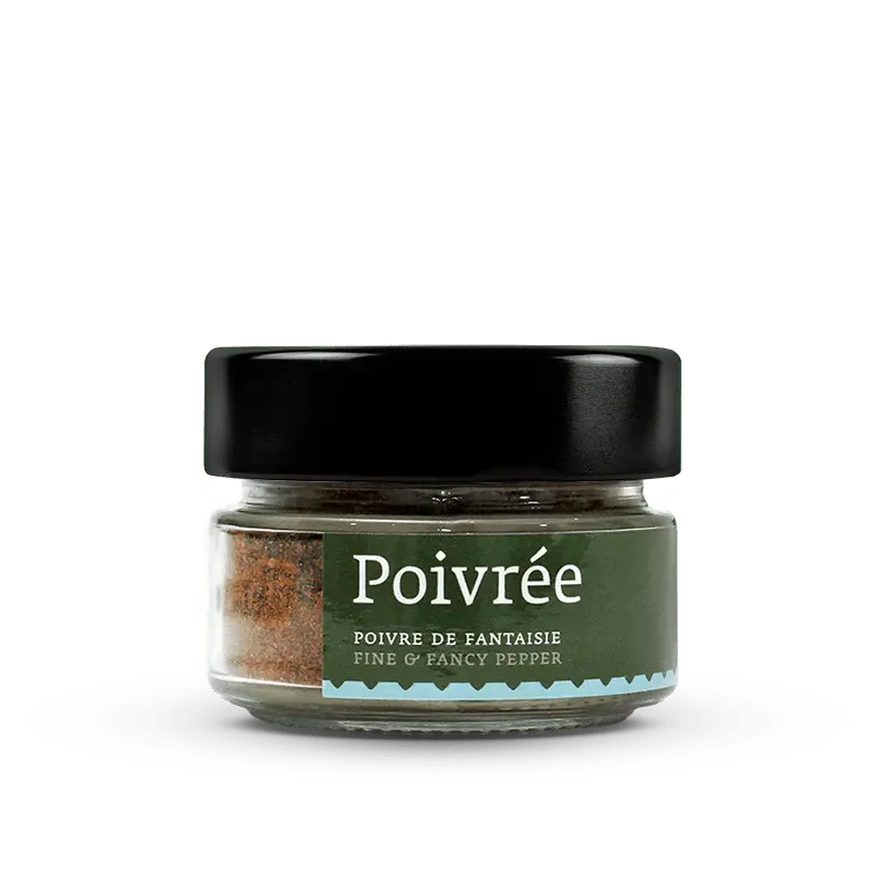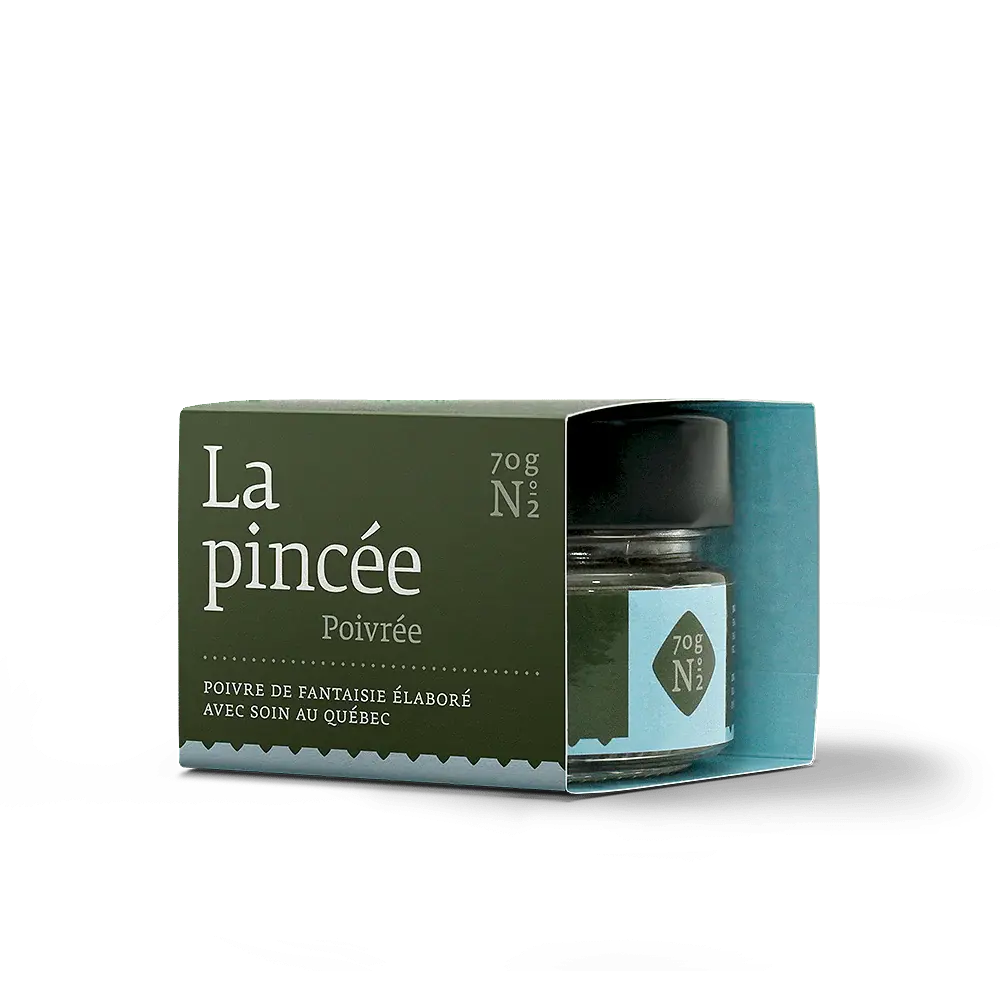 S'inscrireLa pincée Poivrée est composée à base de grains de poivre noir finement mouluset concassés jumelés à un mélange aromatique d’herbes et d’épices fraîchement moulues. Un parfait complice à avoir sous la main pour assaisonner vos recettes préférées. À utiliser avant ou après la cuisson.