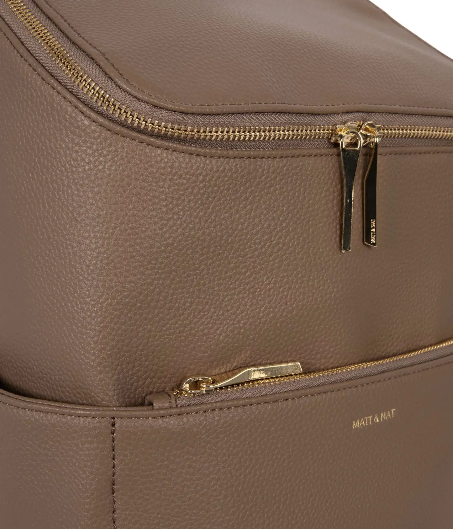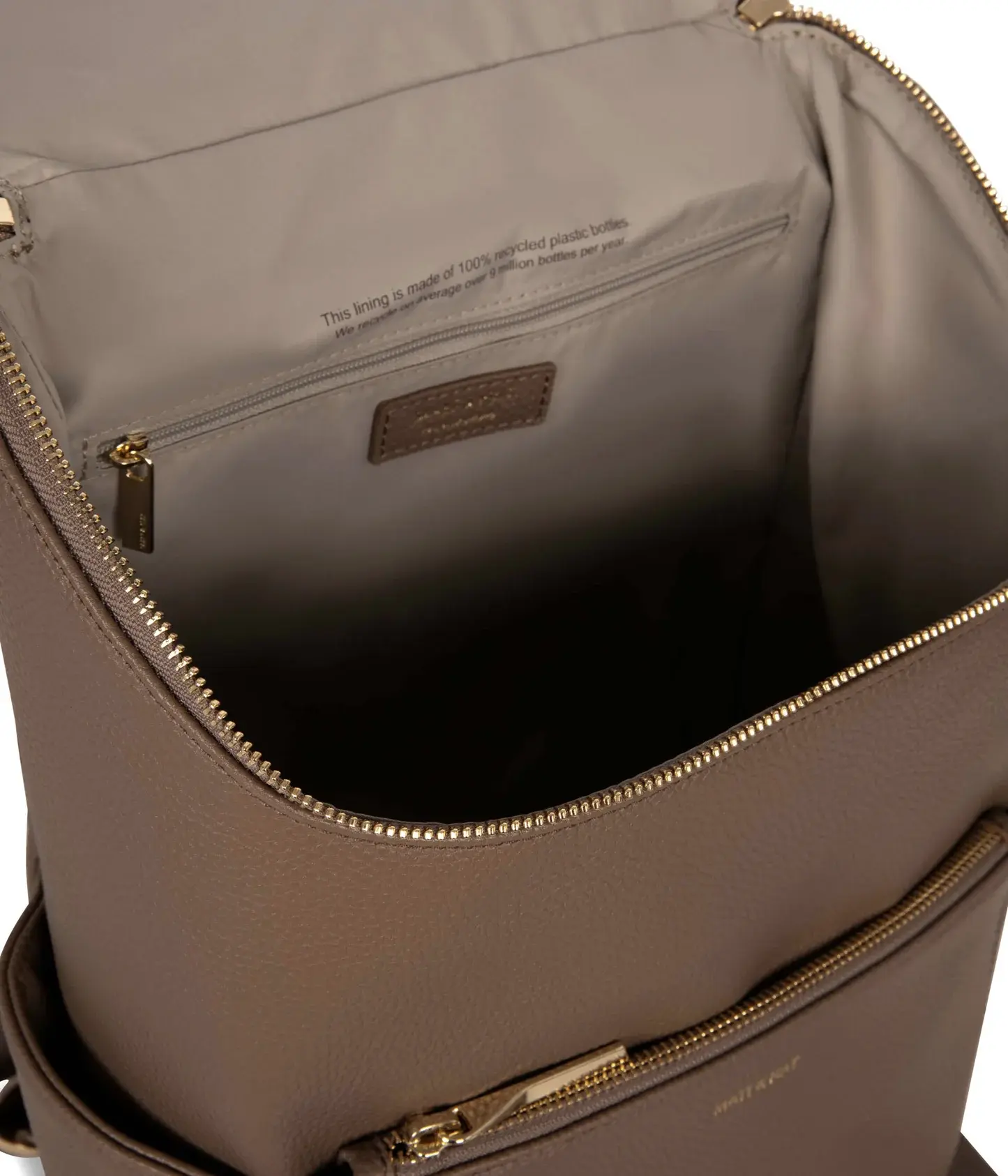 Le matériau de ce sac est fabriqué à partir de 58% de contenu recyclé. Toutes les doublures intérieures de nos sacs sont fabriquées à partir de bouteilles en plastique 100% recyclées. Notre entreprise est entièrement végétalienne et sans cruauté envers les animaux.