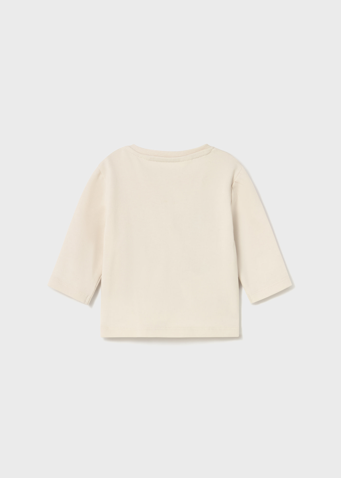 T-shirt à manches longues pour nouveau-né. Col rond. Bouton pression sur l'épaule pour faciliter l'enfilage. Éléments décoratifs: motifs décoratifs, broderies, détail gaufré (high density print), sérigraphie (print).