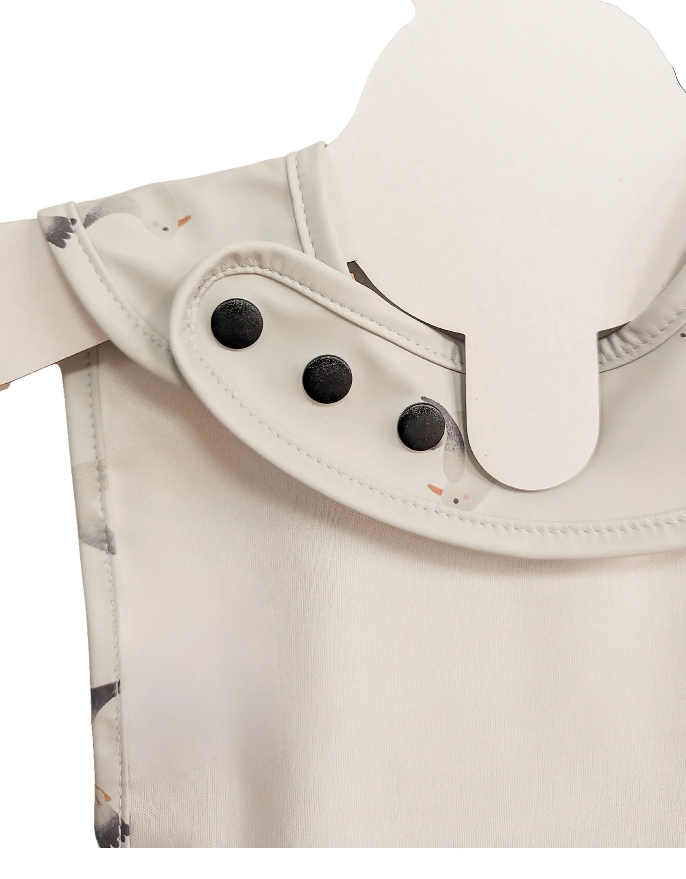 Fait de polyester recyclé à 100% et imperméable, il est résistant aux taches et aux odeurs. Grâce à ses deux boutons pressions, ce joli bavoir reste bien en place lors des repas et s'ajuste à la taille de votre enfant.
