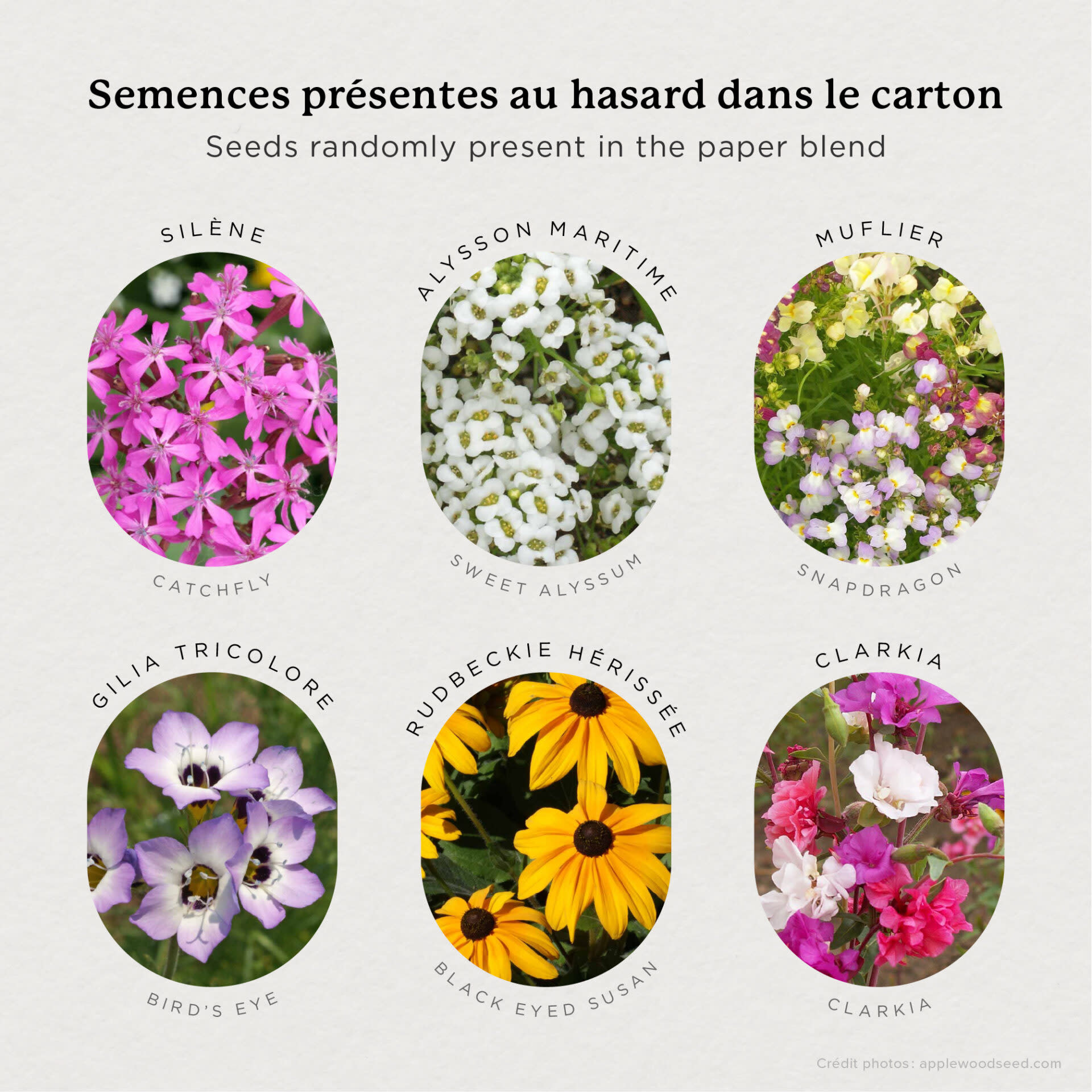 Silène | Alysson maritime | Muflier | Gilia Tricolore | Rudbeckie hérissée | Clarkia