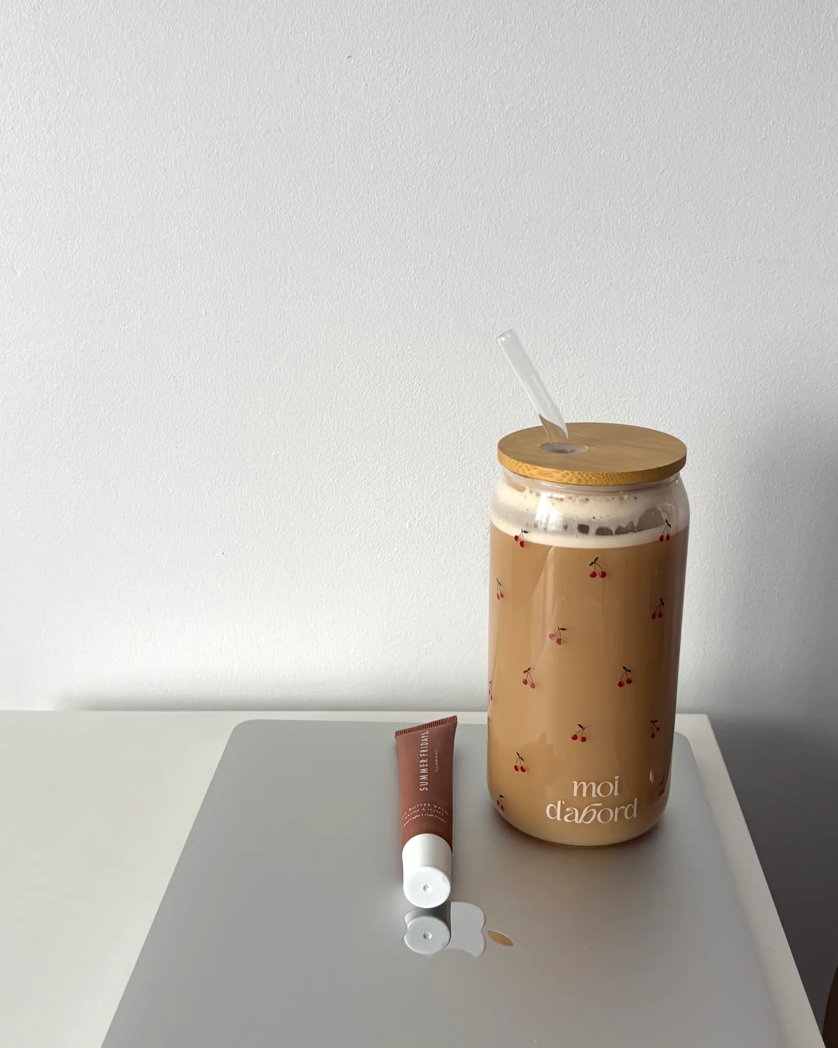 Tumbler en verre aux motifs de petites cerises, avec un couvercle pratique idéal pour déguster tes boissons favorites à la maison ou en sortie.