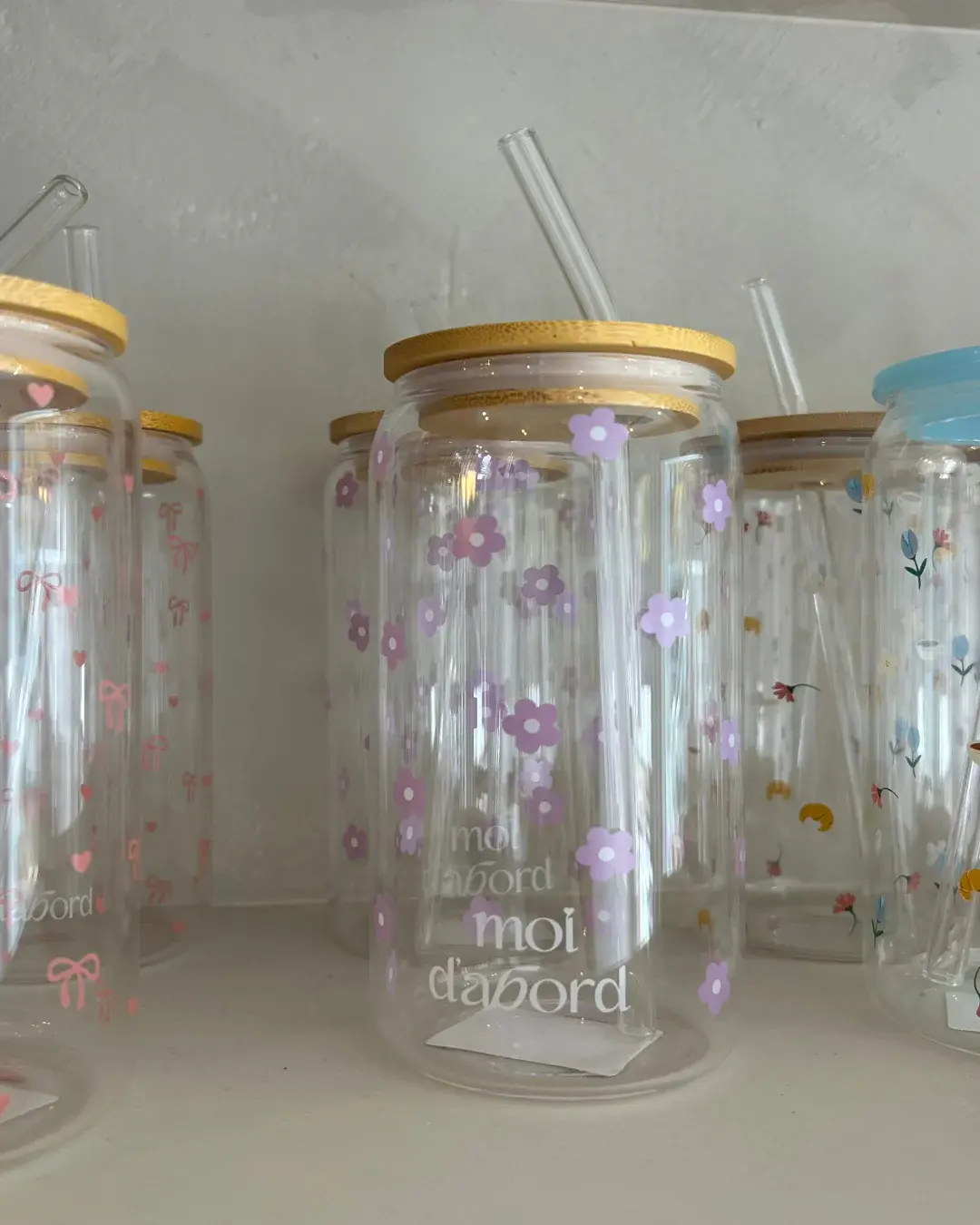 S'inscrireTumbler en verre décoré de petites fleurs lilas, avec un couvercle en bambou, parfait pour savourer ton breuvage préféré à la maison ou sur le pouce