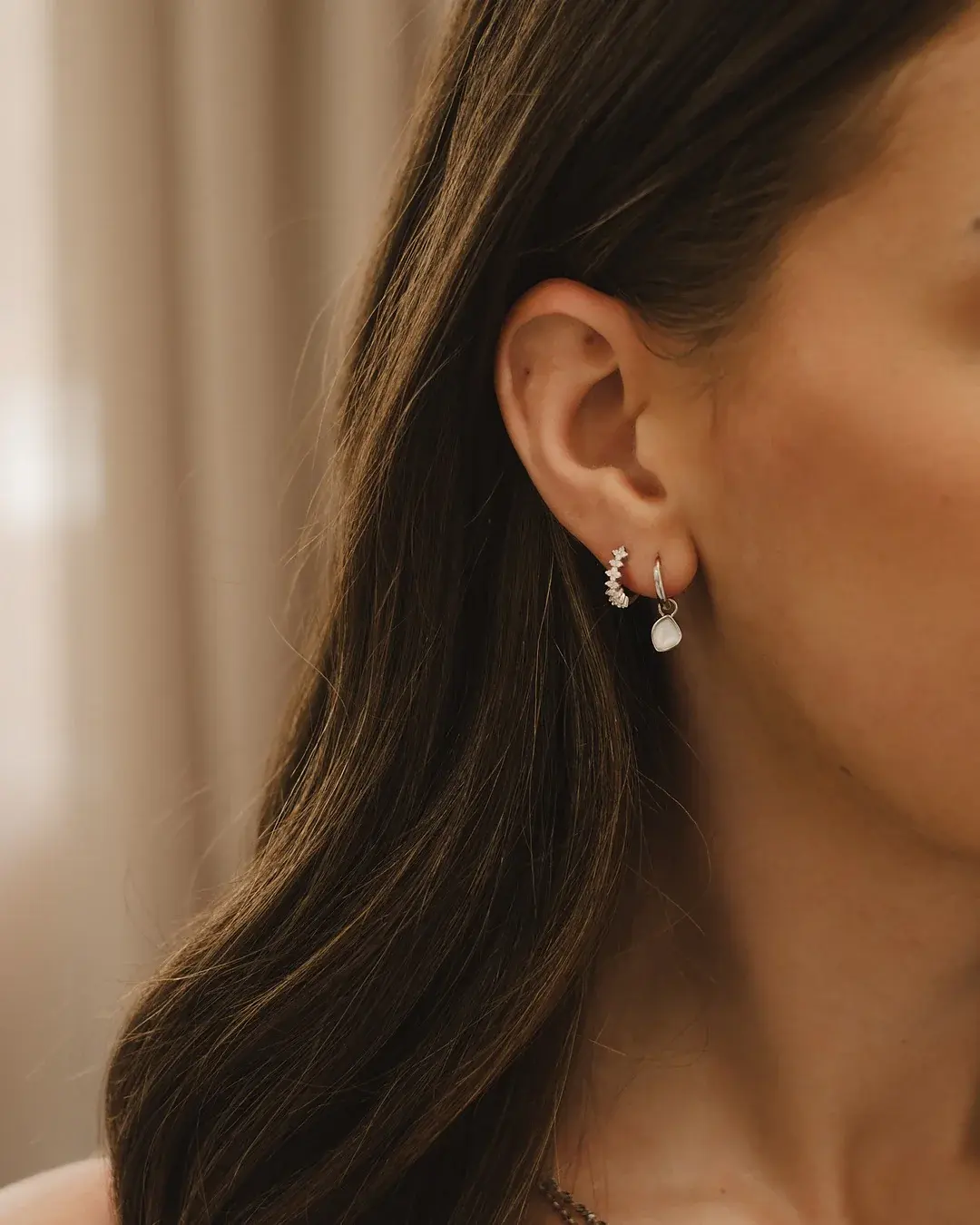 Nos boucles d'oreilles Célia sont délicates et féminines. Il s'agit d'un de nos grands classiques, qui ne se démodera jamais avec son anneau de type dormeuse et son nacre de perle.