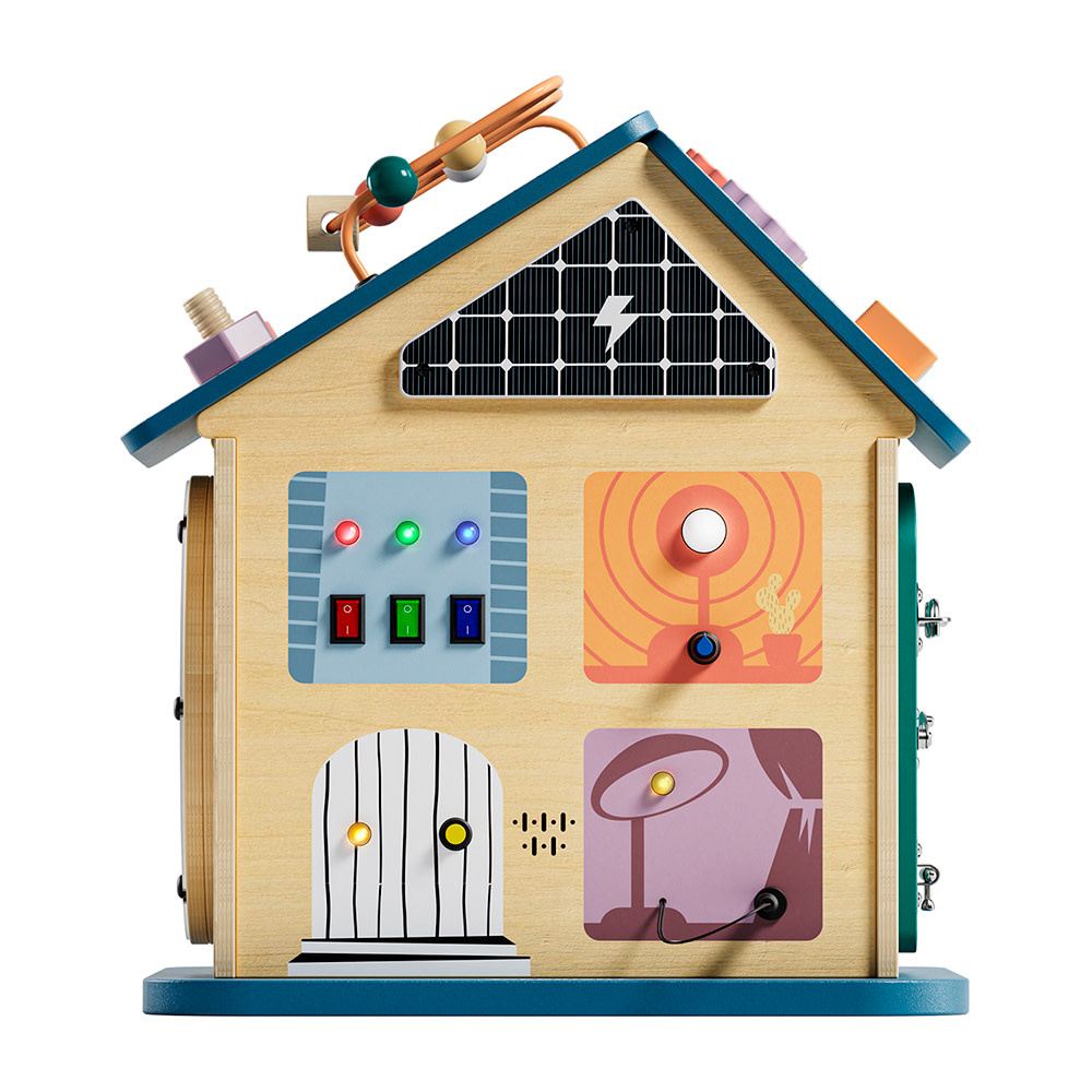 - Exploration tactile : Un bouton à pousser, des prises à brancher comme de véritables lumières, et des interrupteurs à actionner.