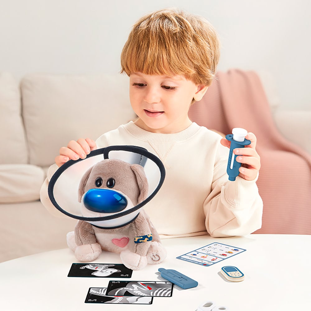 S'inscrireCe kit interactif comprend un chiot en peluche réactif avec des lumières, des sons et des symptômes réalistes qui évoluent avec le temps. Les enfants peuvent soigner leur ami à fourrure à l'aide d'outils amusants tels qu'un stéthoscope, une seringue, un thermomètre et une carte de diagnostic, créant ainsi une véritable expérience pratique. L'ensemble comprend une carte de diagnostic colorée qui apprend aux enfants à faire correspondre les symptômes aux traitements. En suivant la carte, ils apprennent la logique, l'observation et le séquençage d'une manière amusante et captivante. Les enfants peuvent diagnostiquer l'état de leur chiot en peluche à l'aide de lumières qui changent de couleur. Nez bleu? C'est un rhume! Utilisez le faux médicament inclus pour l'aider à se sentir mieux. Parfait pour enseigner l'empathie et les notions élémentaires de santé par le biais d'un jeu interactif. La seringue sans danger pour les enfants incluse permet aux petits de faire des « piqûres » ludiques dans le cadre de la routine de guérison. Qu'il s'agisse d'un rhume ou d'un problème cardiaque, l'utilisation de la seringue fait partie d'un processus de traitement gratifiant qui enseigne la relation de cause à effet. Le stéthoscope robuste et adapté aux enfants permet aux jeunes médecins d'écouter les battements de cœur de leur chiot. C'est un excellent moyen d'encourager la curiosité à l'égard du corps, tout en favorisant les jeux de rôle et la motricité fine. C'est un mélange parfait de jeu imaginatif, de développement émotionnel et d'apprentissage précoce.