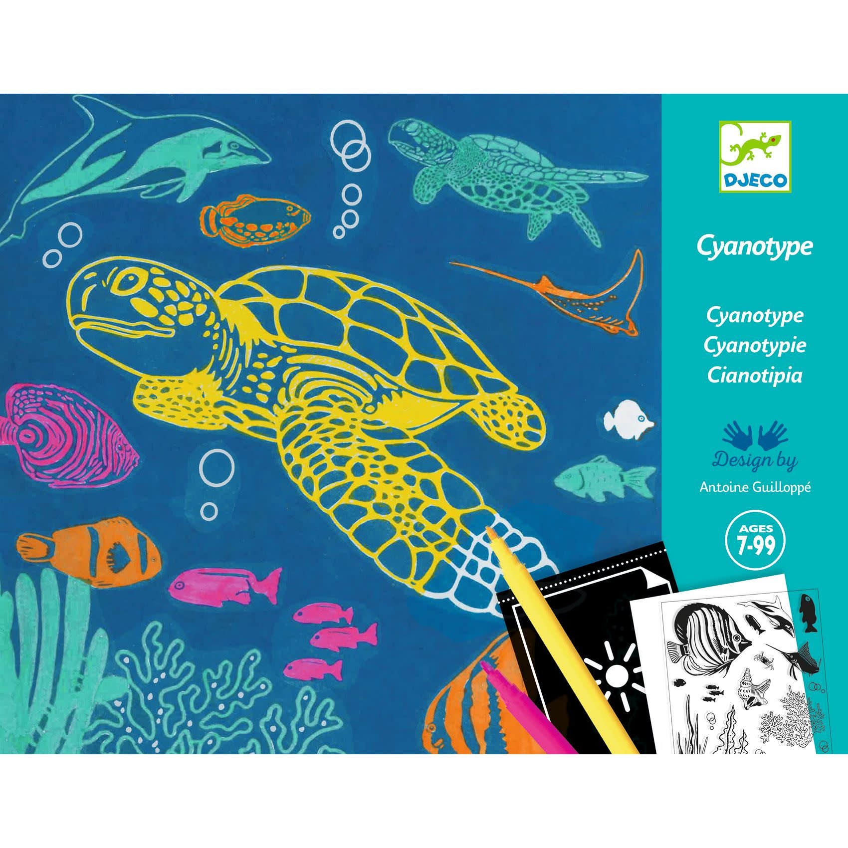 S'inscrireMagique, cette activité s’inspire d’un procédé emprunté à la photographie : le cyanotype. À l’aide de motifs opaques, l’enfant crée des décors sur un papier photosensible. Après une exposition au soleil, le papier est marqué des motifs en négatif. Il n’y a plus qu’à rincer le papier dans un bain d’eau claire et le décor se révèle sur fond bleu ! Avec 4 feutres pour transformer les 4 tableaux en fonds sous-marins multicolores.
