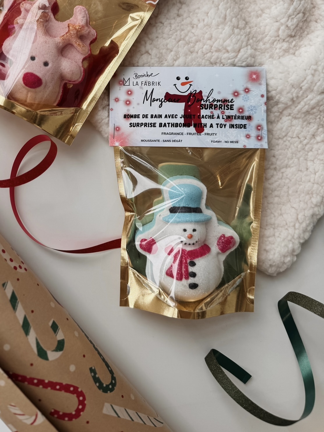 Cette bombe en forme de bonhomme de neige cache un jouet mystère à l'intérieur, ajoutant une touche de joie à votre bain. Laissez briller la magie tout en prenant soin de la peau délicate de vos petits aventuriers.