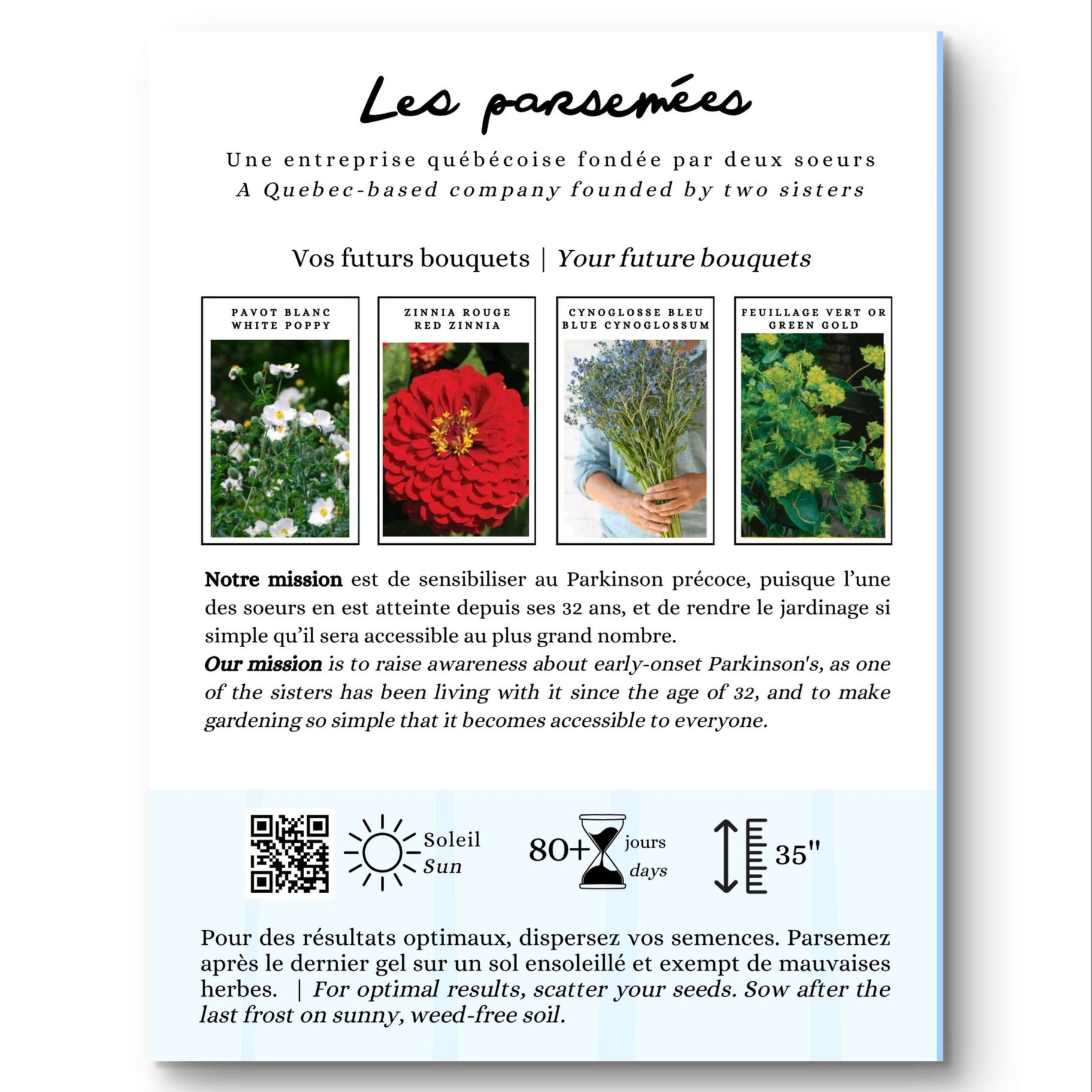 S'inscrireL'agencement 80 jours est idéal pour les jardiniers passionnés qui souhaitent un jardin vibrant et raffiné en peu de temps. Ce mélange propose quatre variétés complémentaires, soigneusement choisies pour leur esthétique harmonieuse et leur croissance efficace. Il inclut désormais :