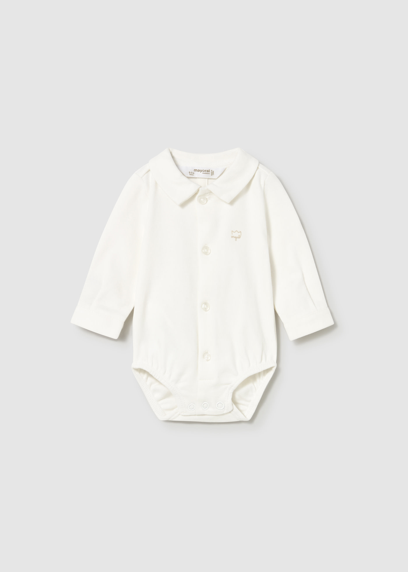 S'inscrireBody à manches longues pour nouveau-né. Col chemise. Fermeture à bouton-pression dans l'entrejambe. Fermeture avec des boutons sur le devant.