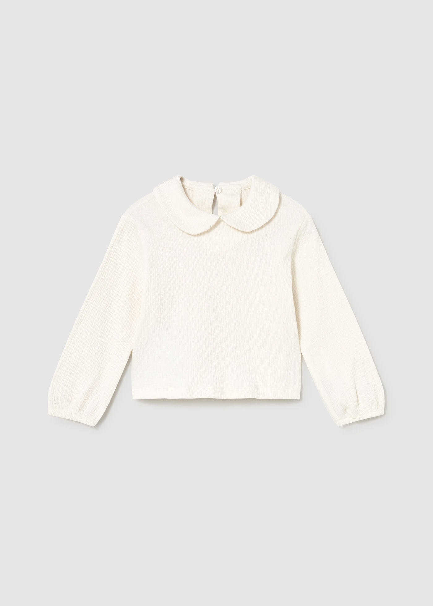 T-shirt à manches longues pour bébé. Col bébé. Petite ouverture dans le dos avec fermeture par bouton pour faciliter le passage du vêtement. Modèle bouclé. Bas avec bande élastique pour un meilleur ajustement.