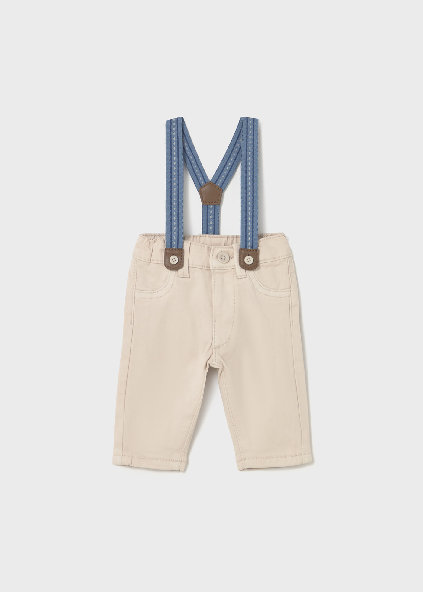 Pantalon pour nouveau-né. Fermeture avec un seul bouton. Ceinture élastique réglable avec boutons à l'intérieur de la ceinture pour un meilleur ajustement. Design bretelles amovibles. Poches avant et arrière décoratives simulées.