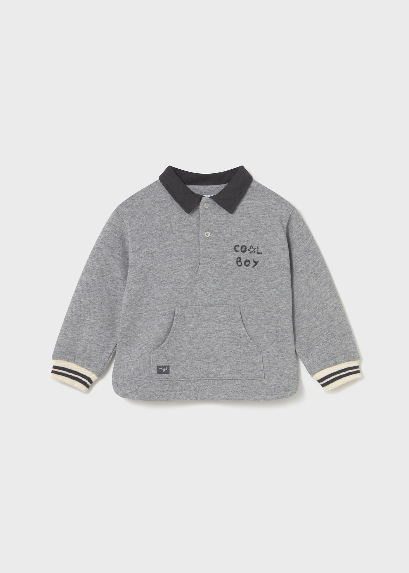 S'inscrireSweat à manches longues pour bébé avec poignets élastiques contrastés. Col polo classique. Poche fonctionnelle à l'avant. Éléments décoratifs: broderies sur le devant et le dos du vêtement.