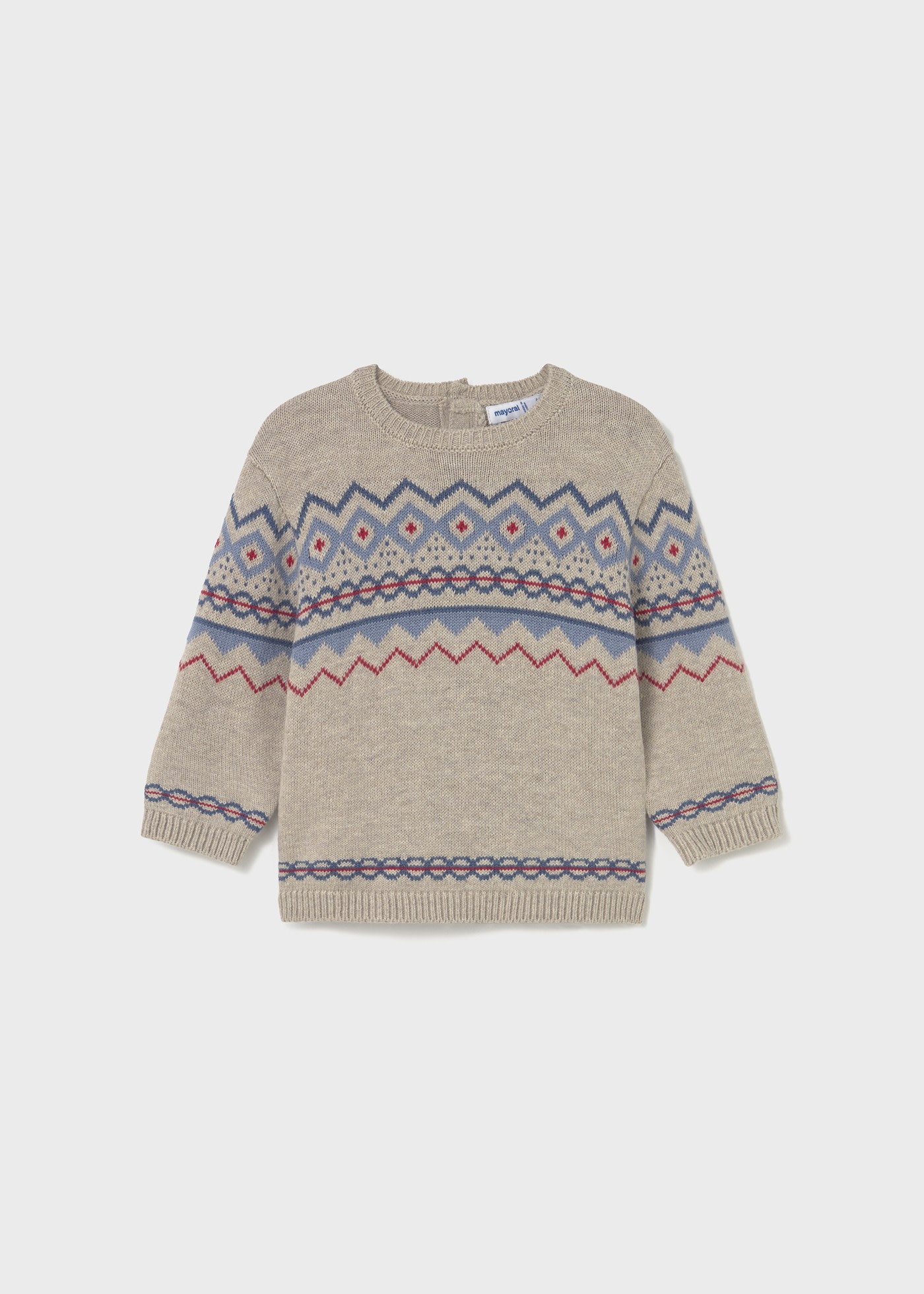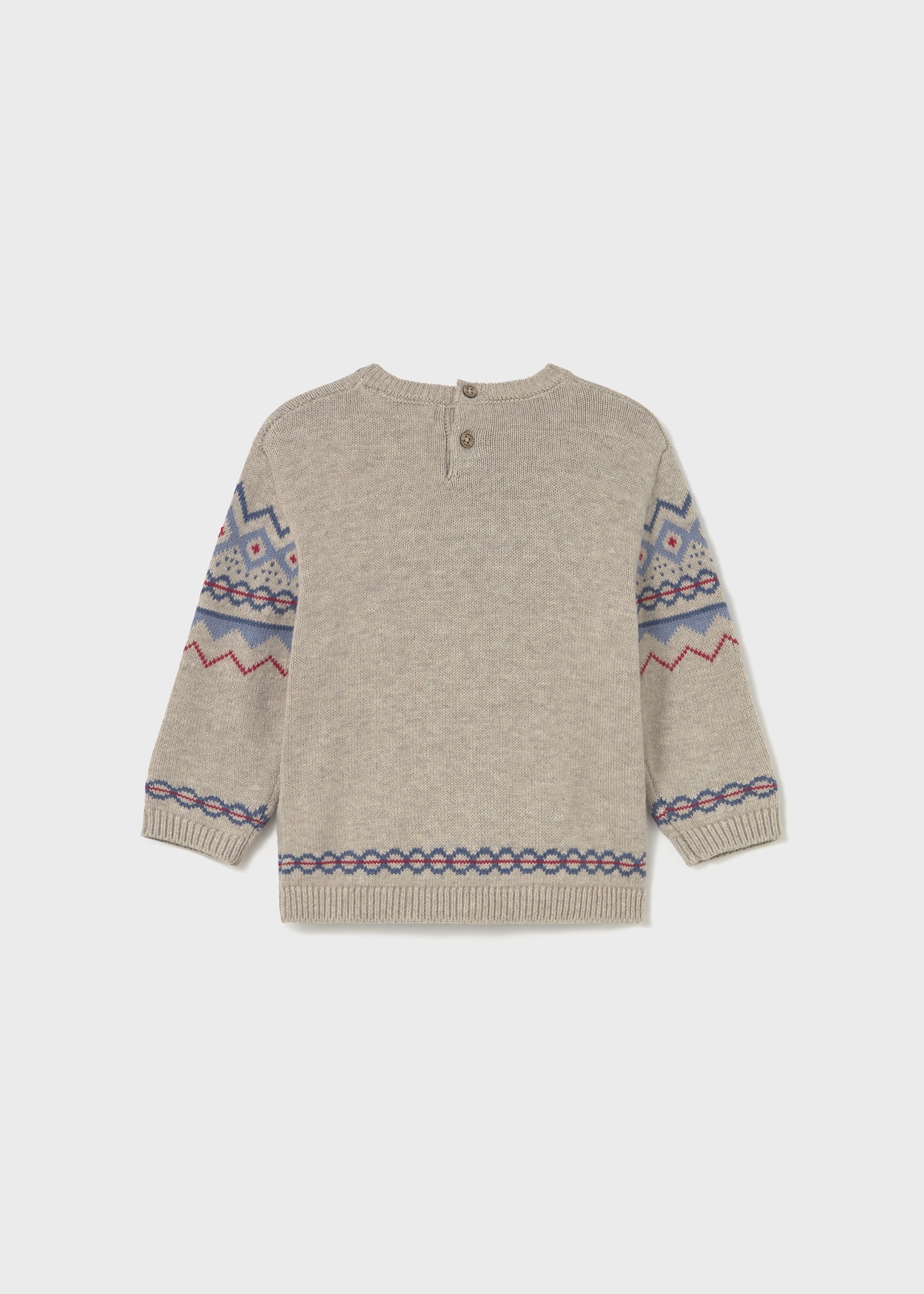 Pull à manches longues pour bébé. Col rond. Bouton de fermeture sur le col pour un ajustement facile. Confection de différents tissus pour un design unique et spécial. Éléments décoratifs: détails côtelés. Motifs de points jacquard.