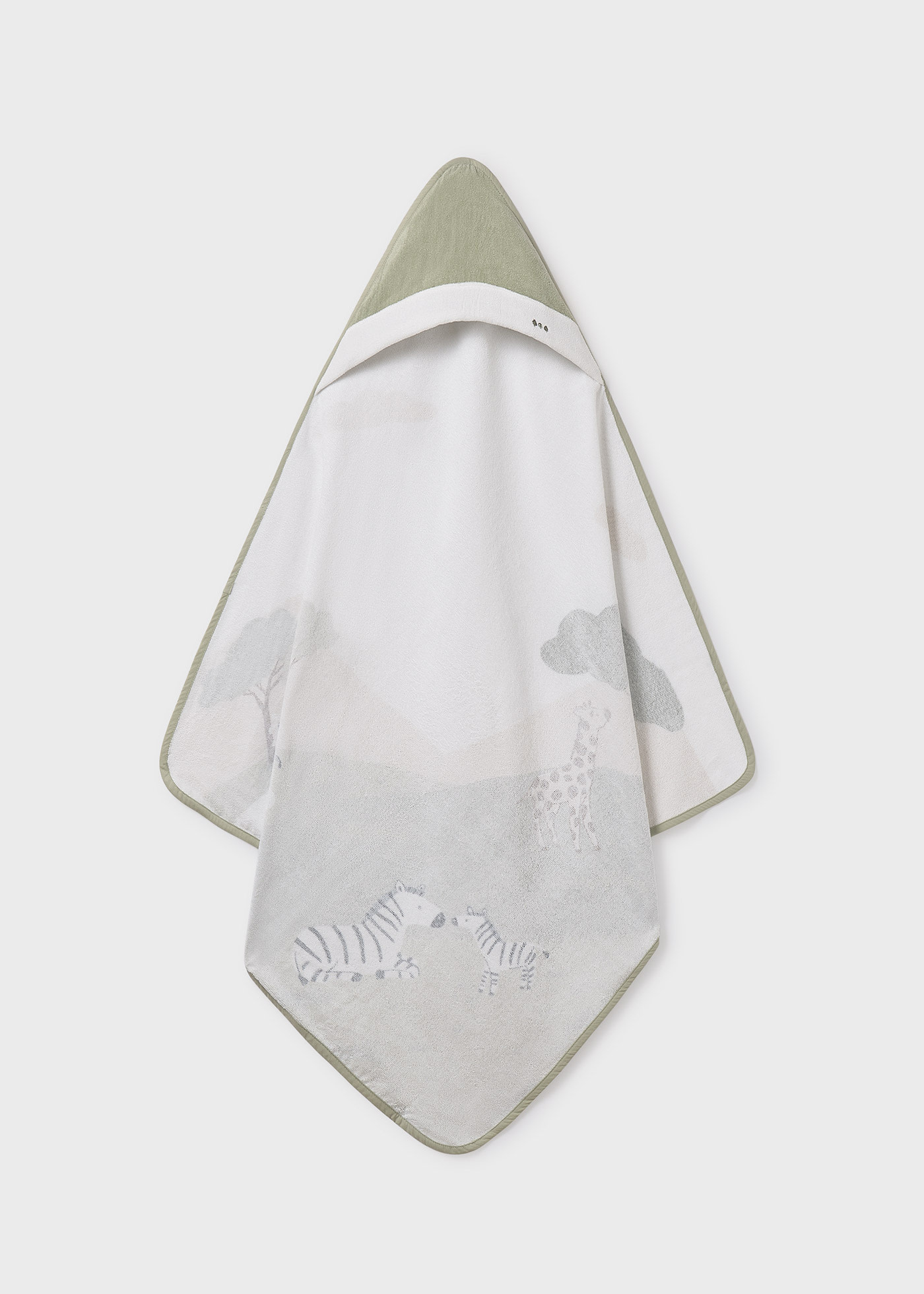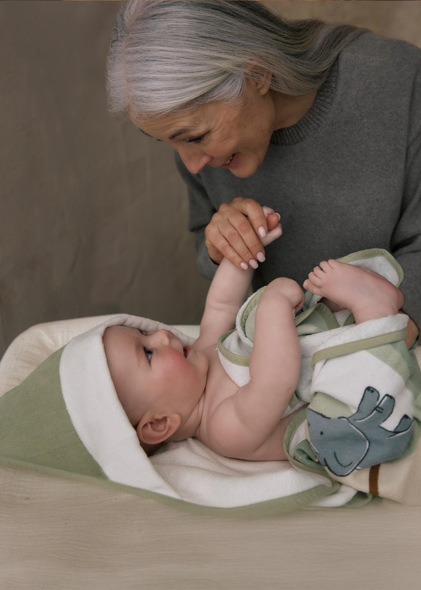 S'inscrireServiette type cape de bain enveloppante avec laquellle vous pourrez sécher et réchauffer votre bébé après le bain. Il s'agit d'un article de design unisexe d'une grande polyvalence en raison de la neutralité de ses tons et de sa forme.