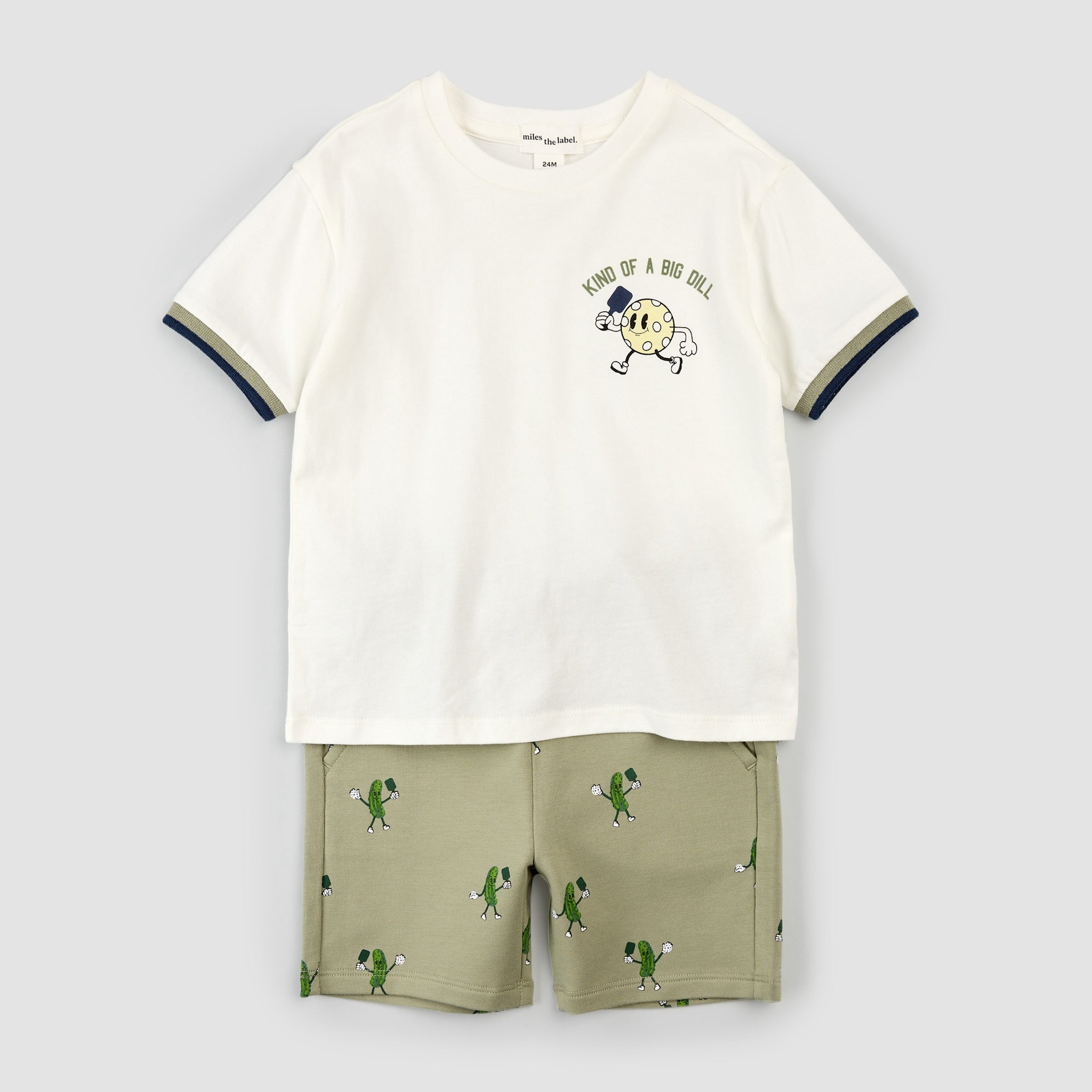Préparez-vous pour une partie de plaisir avec cet ensemble short original orné d’un imprimé ludique « Pickleball Boy » sur le short et notre motif « Kind of a big dill » sur le haut. L'encolure côtelée et les ourlets contrastés des manches créent un style sportif et le short en tissu éponge est doté d'une bande de taille élastique pour plus de confort. Idéal pour les petits champions, cet ensemble est léger et confortable pour être porté toute la journée.