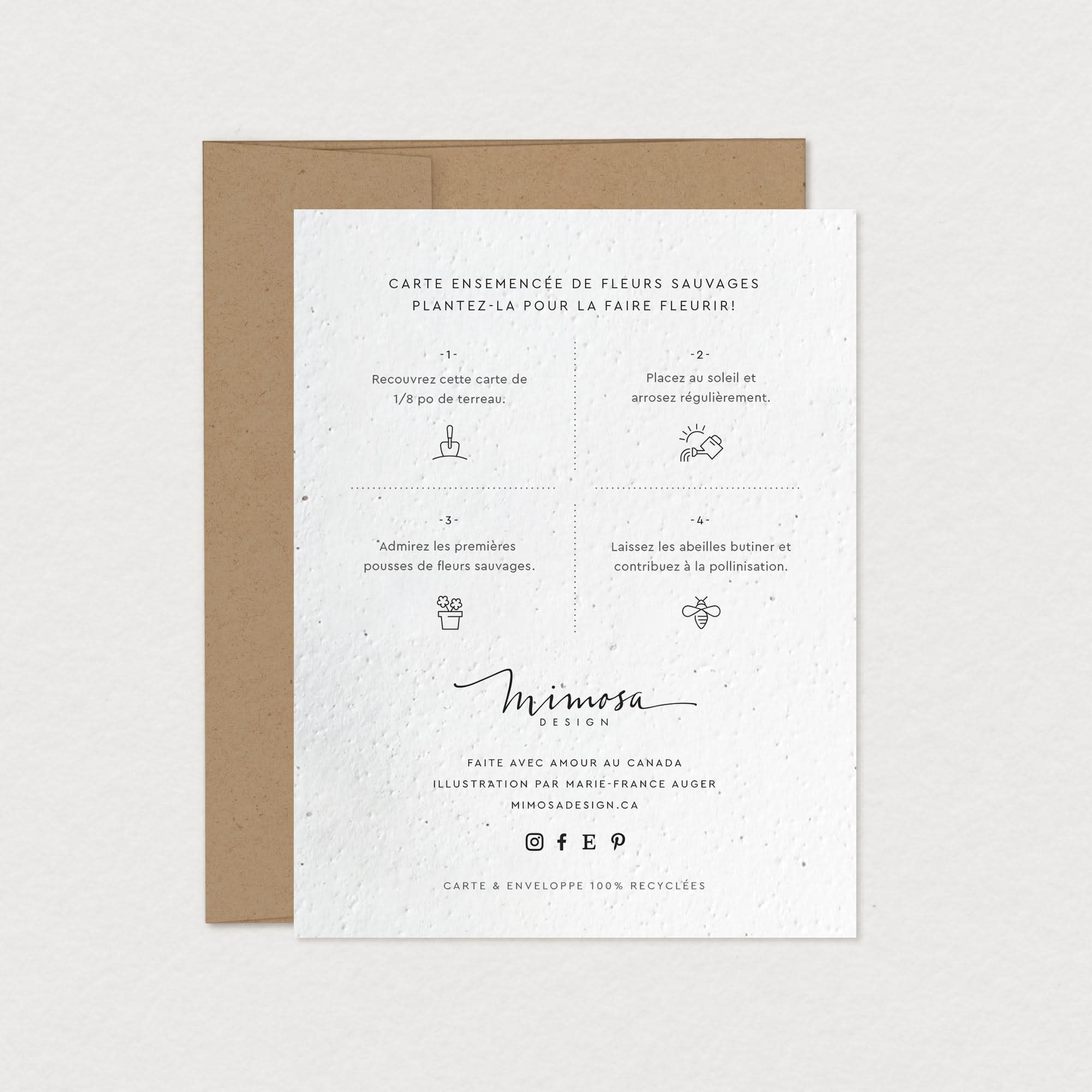 S'inscrireDélicates et raffinées, les cartes de souhaits à planter de Mimosa Design se démarquent par leur style minimaliste et naturel. En plantant cette carte, vous obtiendrez en quelques semaines de jolies fleurs sauvages prêtes à être polliniser par nos petites abeilles! Offrir une carte ensemencée est un geste simple et éco-responsable. Ensemble, conjuguons nos efforts pour que notre environnement soit plus vert, une carte de vœux à la fois!