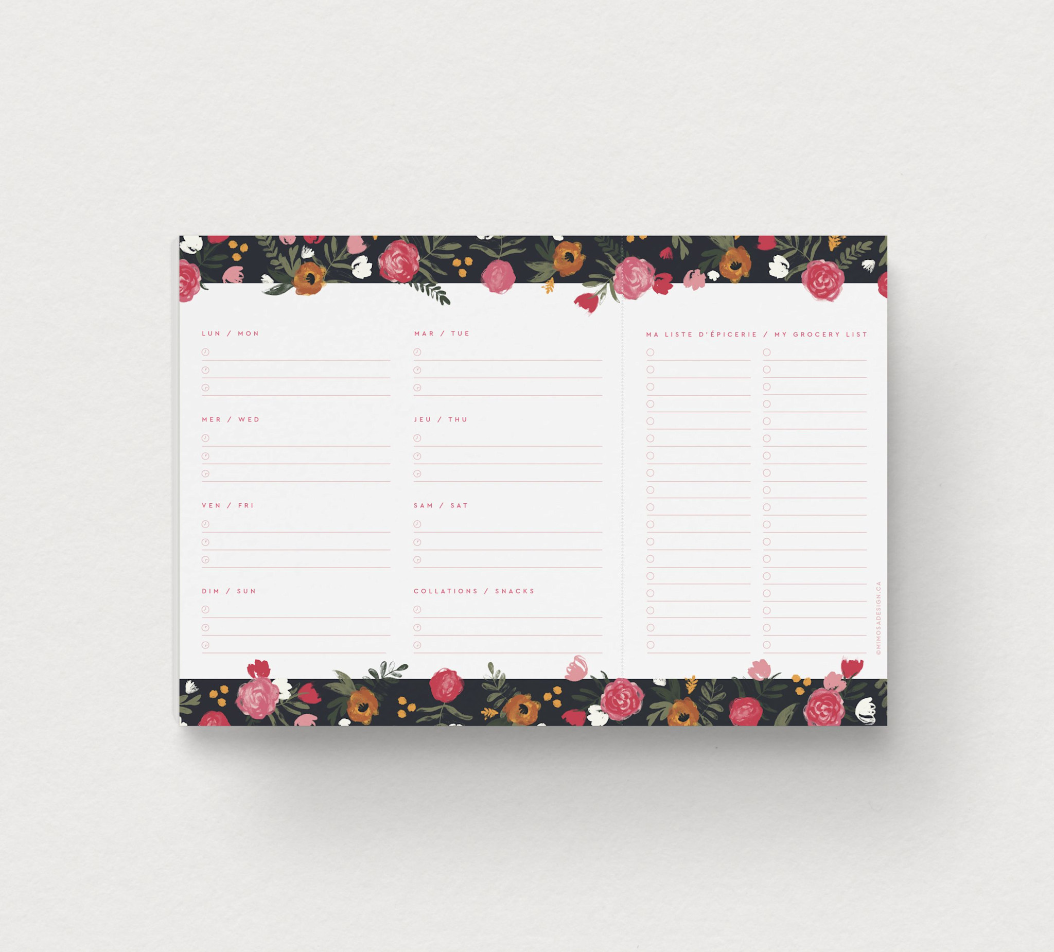 - 7 jours de la semaines séparés en déjeuner/dîner/souper + une zone collations
