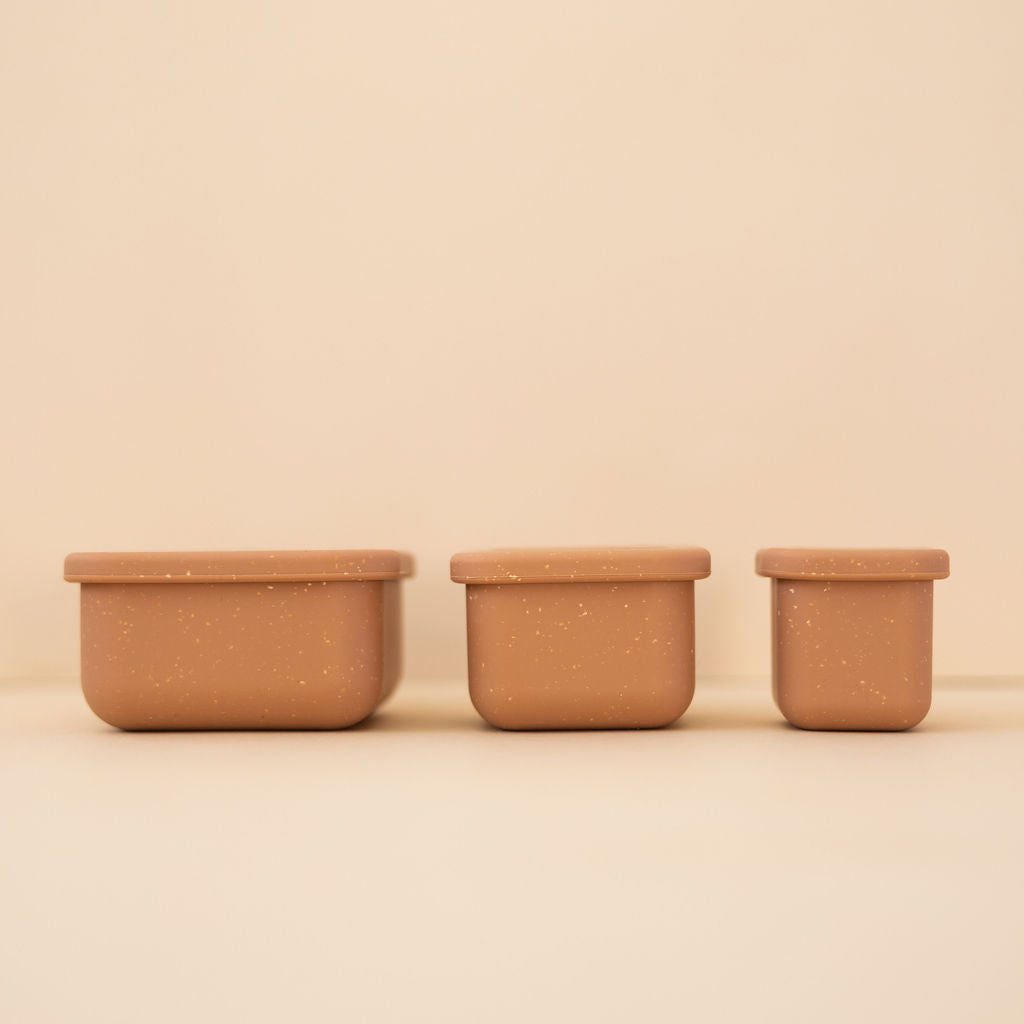 Ensemble de bols à collation avec couvercle refermable. Silicone alimentaire sans BPA. Laver avec du savon et un chiffon mouillé ou au lave-vaisselle. Allant au micro-ondes et au congélateur. Paquet de 3.
