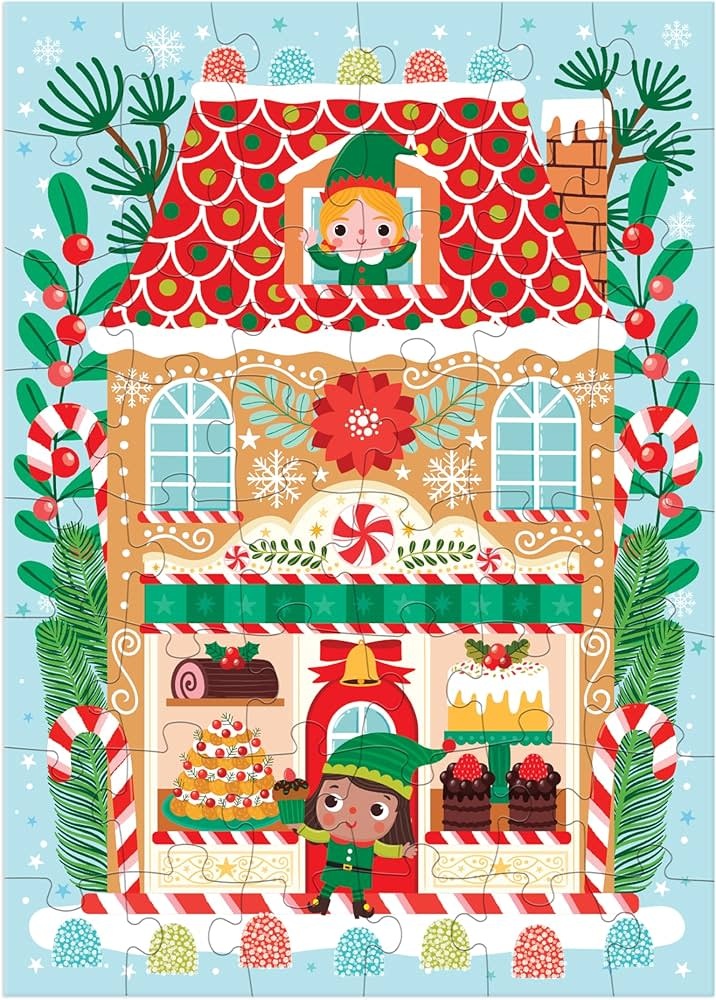 S'inscrireLe puzzle décoratif de 48 pièces « Santa's Bakery » de Mudpuppy représente une boulangerie festive colorée, avec des elfes affairés et des friandises de Noël !