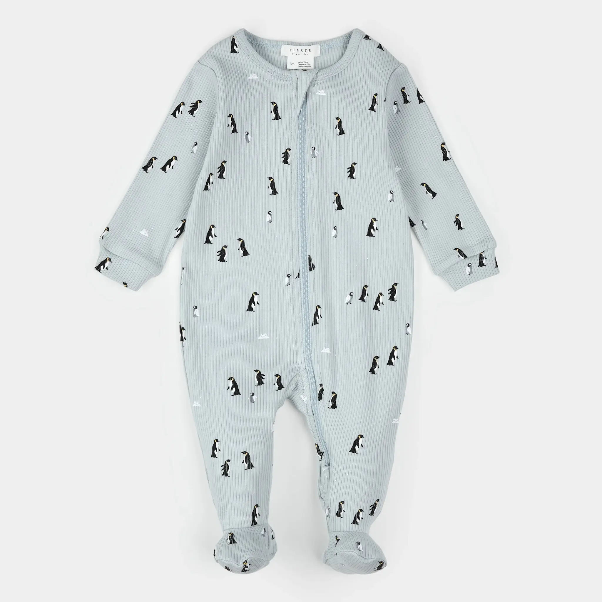 PYJAMA À PATTES CÔTELÉ À IMPRIMÉ DE PINGUOUIN - BLEU
