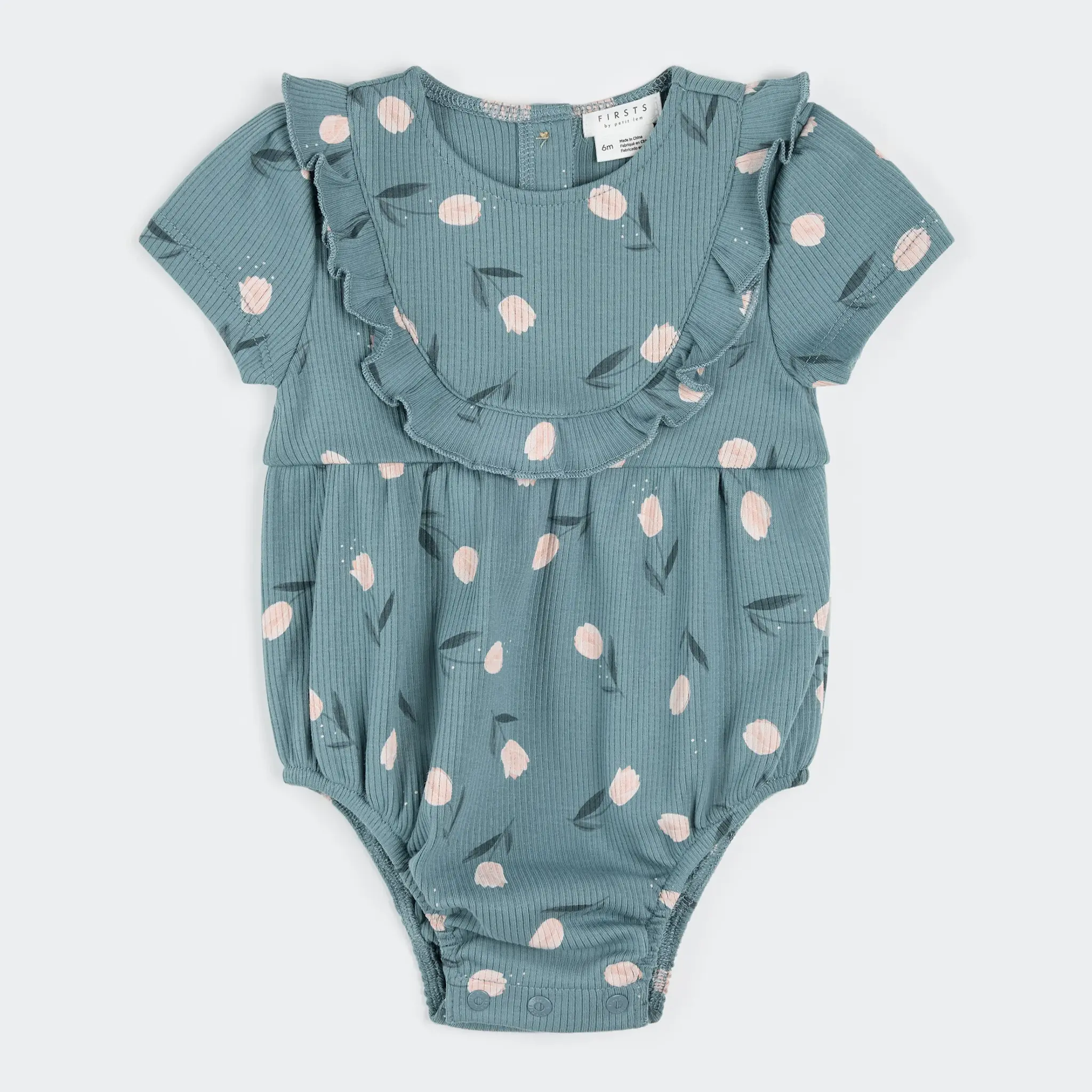 ROMPER BULLE CÔTELÉ À IMPRIMÉ TULIPES - BLEU CANARD